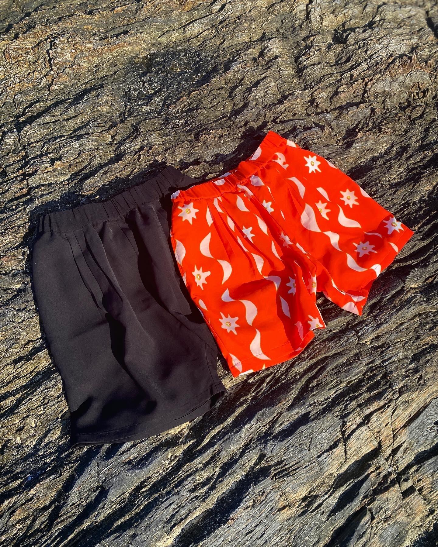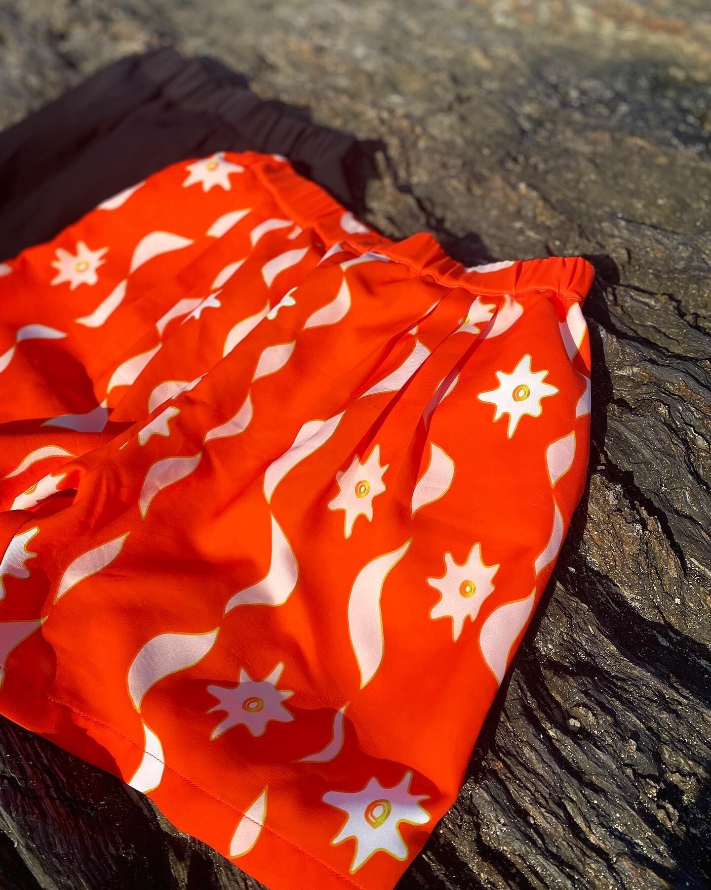 ORANGEの発色がきれいな"海に映るサンセット"のプリント柄が魅力のショートパンツです。